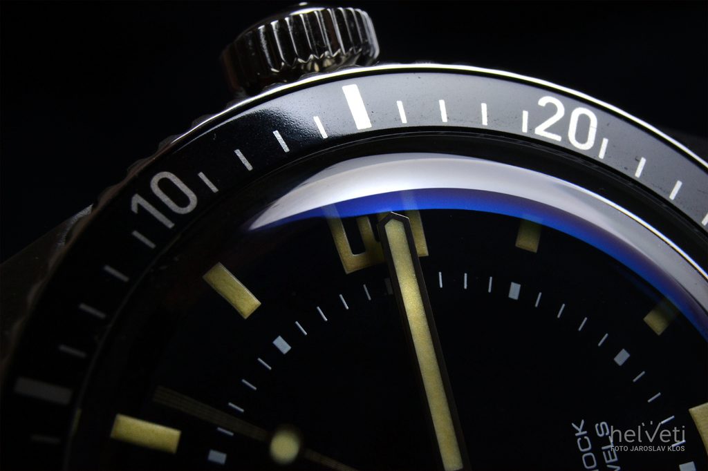 The perfectly clear dial is protected by a domed sapphire crystal that is maximally scratch-resistant. Legibility in sharp light is ensured by an internal anti-reflective coating. In darkness and low light conditions, the luminescence of Superluminova on the hands and indexes is useful. The water resistance of this watch is 100 m ( 10 ATM), so it can handle contact with water, such as swimming. The water resistance is supported by a screw-down crown.