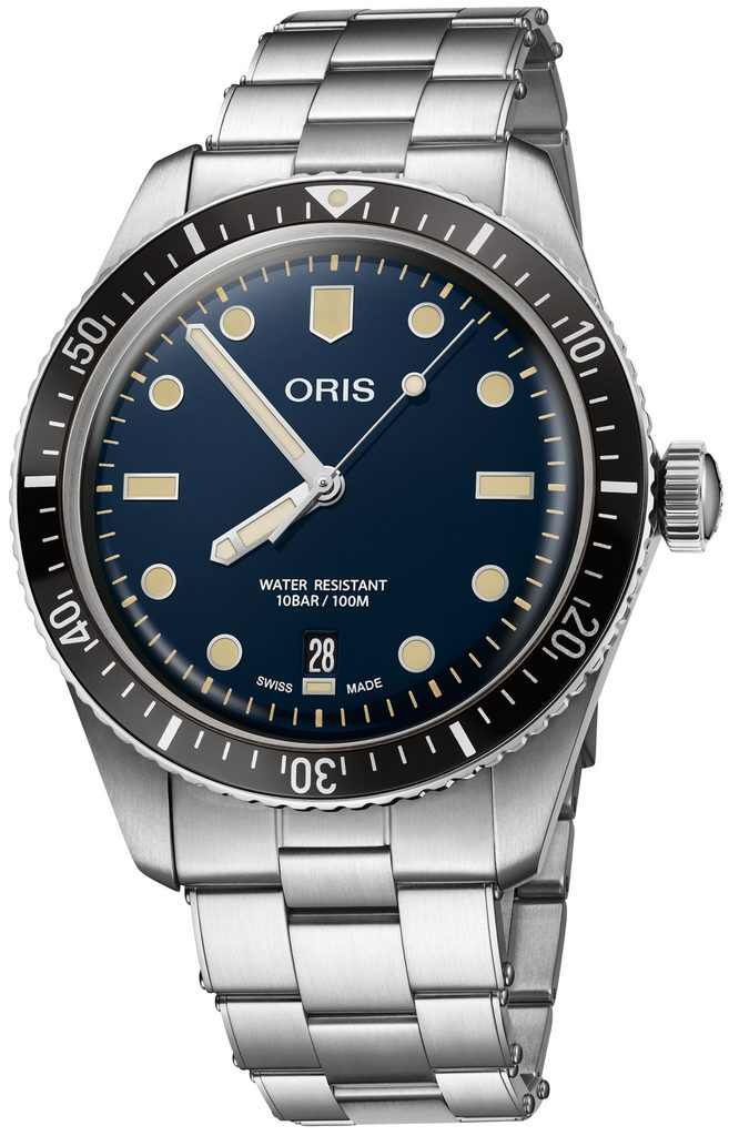 The case of the Oris Divers Sixty-Five Date 0173377074055-0782018 is made of stainless steel, as is the bracelet. Inside its interior, the Oris 733 Swiss mechanical movement (based on the Sellita SW200-1) with automatic winding works reliably. This movement has 26 stone settings and operates at a frequency of 28,800 semi-frequencies per hour (4 Hz). There is a handy date indicator at position 6. A one-way rotating diving lunette is used to measure time periods.