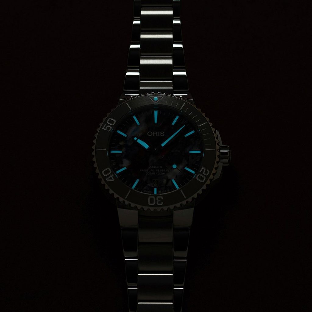The Swiss Oris Aquis Date Upcycle 01 733 7766 4150-Set watch impresses with its specific, highly attractive "diver" design and excellent workmanship. This model will serve you well not only underwater, but also in everyday wear. This version has a dial made of recycled plastic, fished out of the ocean. This means that each piece has a slightly different dial design, making it completely unique.