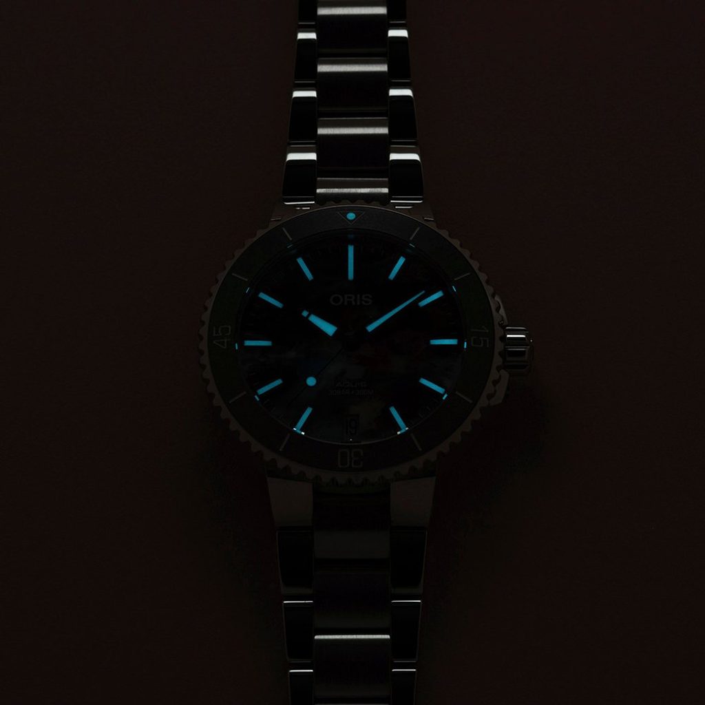 The case of the Oris Aquis Date Upcycle 0173377704150-Set is made of stainless steel, as is its bracelet. Inside its interior, the Oris 733 Swiss mechanical movement (based on the Sellita SW200-1) with automatic winding works reliably. This movement has 26 stone settings inside and operates at a frequency of 28,800 semi-frequencies per hour (4 Hz). The movement's operation can be observed thanks to the transparent mineral glass dial. A handy date indicator is located at position 6. A unidirectionally rotatable ceramic diving lunette is used to measure time periods.