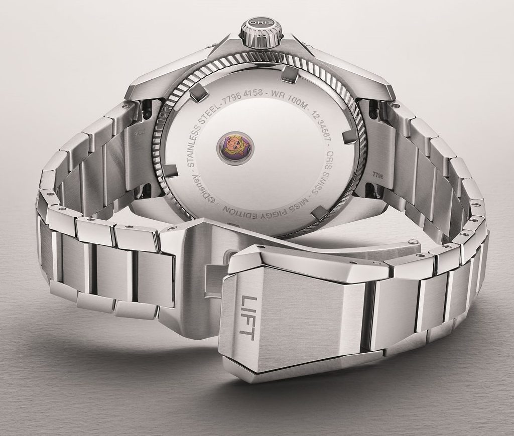 The case of the Oris ProPilot X Miss Piggy Edition 0153177964158-0781705LC is made of stainless steel, as is its bracelet. Inside, the Oris 531 Swiss mechanical movement (based on the Sellita SW100) with automatic winding works reliably. This movement has 25 stone fits within it and operates at a frequency of 28,800 semi-frequencies per hour (4 Hz). You can then observe the portrait of Miss Piggy on the dial using a mineral slide.