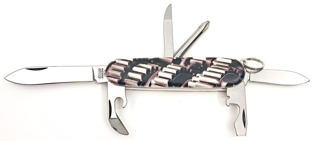 Stovka is a traditional knife with many useful functions in a modern design. The biggest advantage of the knife is its size, which makes it fit comfortably into any pocket and therefore a great helper in any situation. The blade of the knife is made of high quality 420 stainless steel with a hardness of 53-55 HRc. The designer blade made of high quality plastic is printed with a new special technology that guarantees different UV LED printing designs combined with 3D effects. The knife houses a small and a large blade, a can opener, a spike, a Phillips screwdriver and a bottle opener.