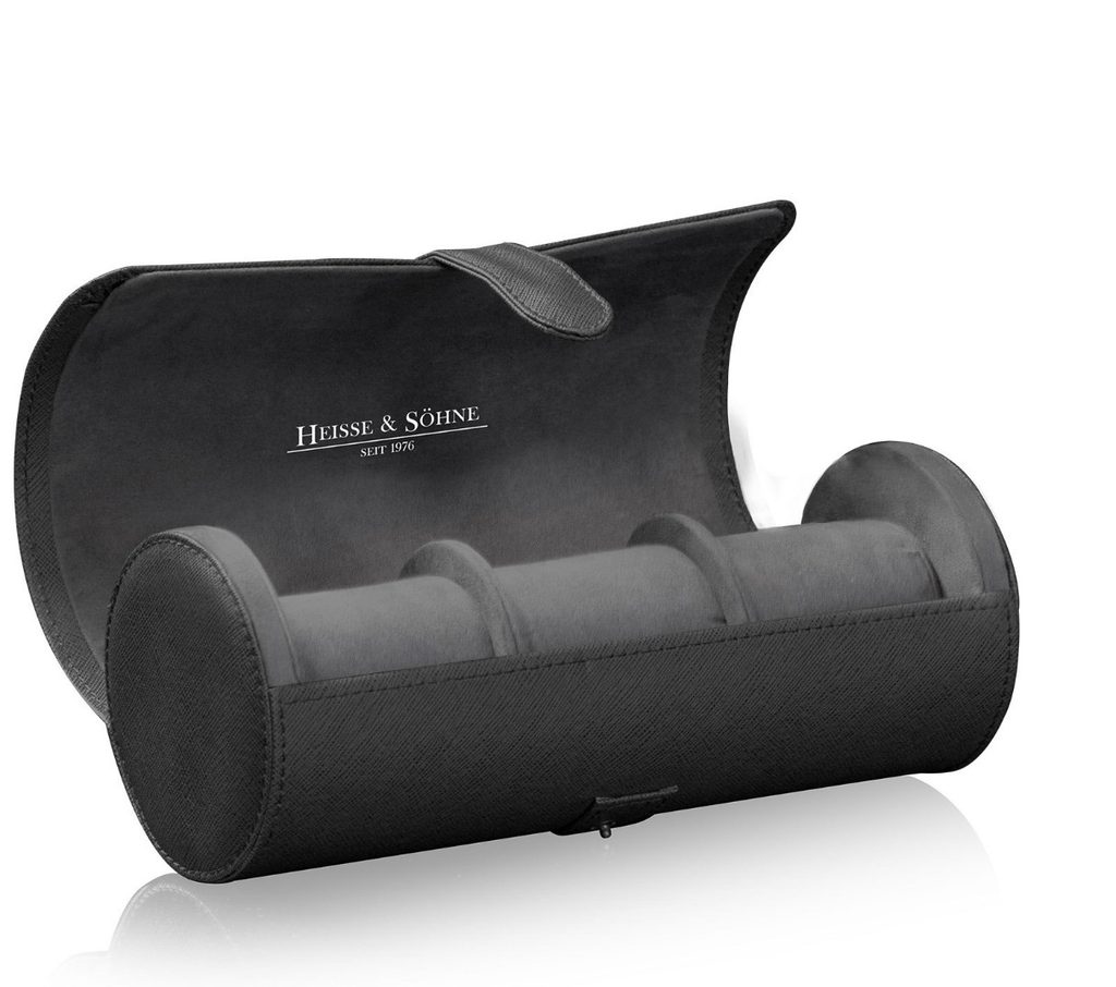 Elegant watch case Heisse & Söhne Rondo 3 70019-95 for 3 watches. Made of high quality synthetic leather in black with light grey velour interior.