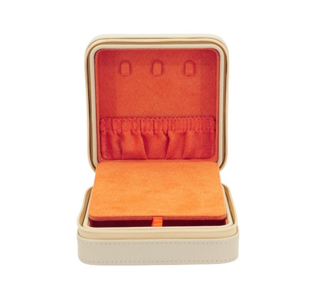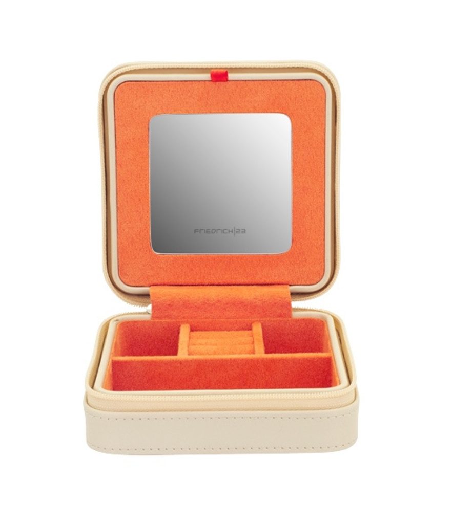 The Friedrich Lederwaren Boho 20134-1 beige travel jewellery box with orange interior is made of synthetic leather. On the top of the case we find embossed feathers.