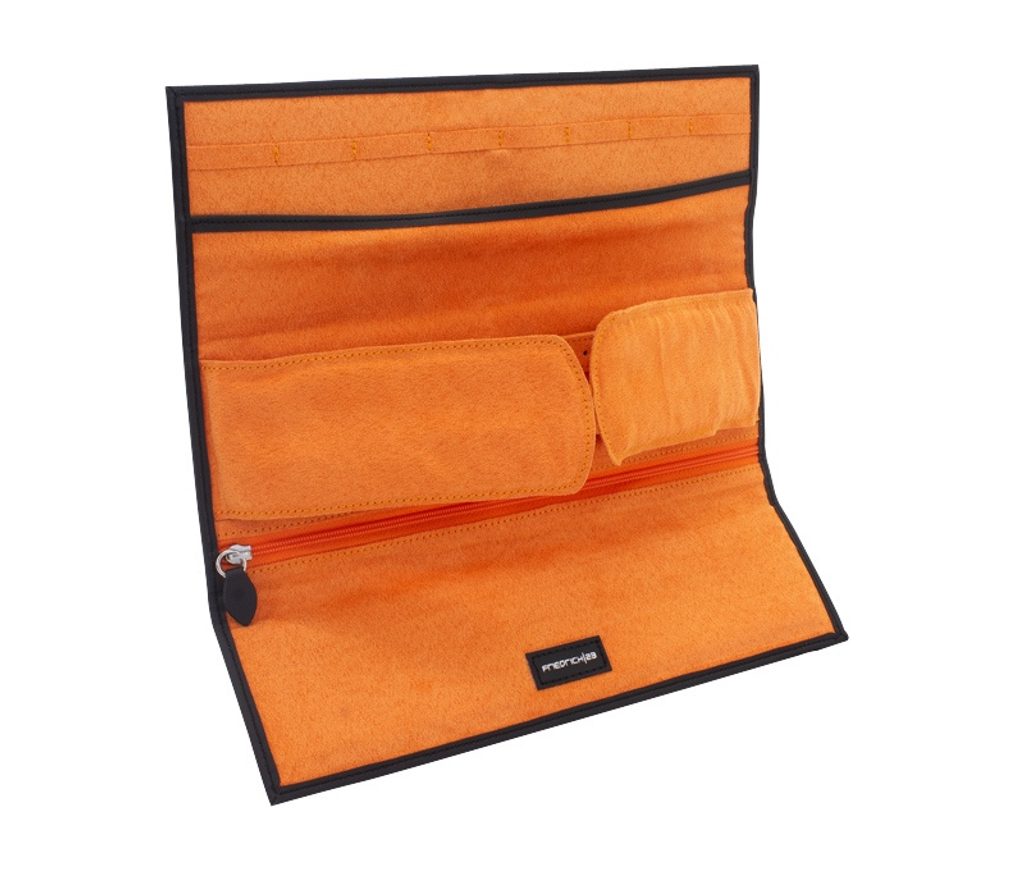 The Friedrich Lederwaren Boho 20137-2 black travel jewellery box with orange interior is made of synthetic leather. On the top of the case we find embossed feathers.