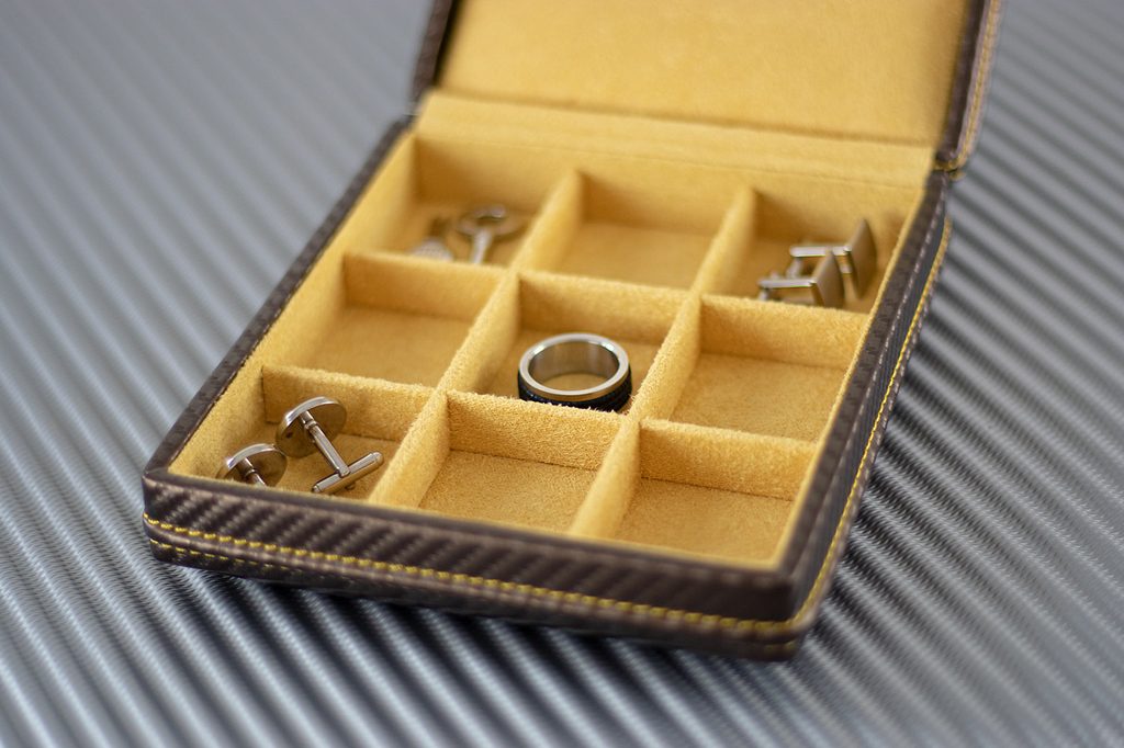 The Friedrich Lederwaren Cubano 27033-6 brown jewellery box is made of synthetic leather with a carbon pattern.