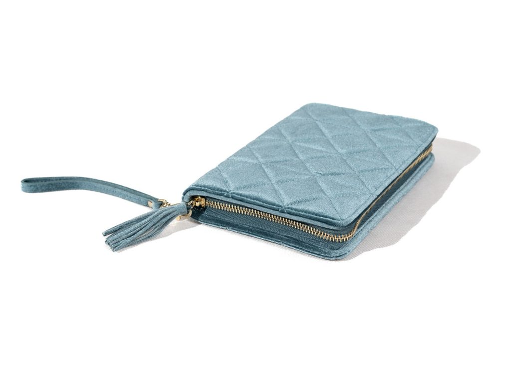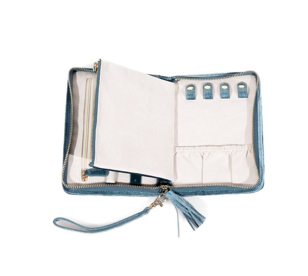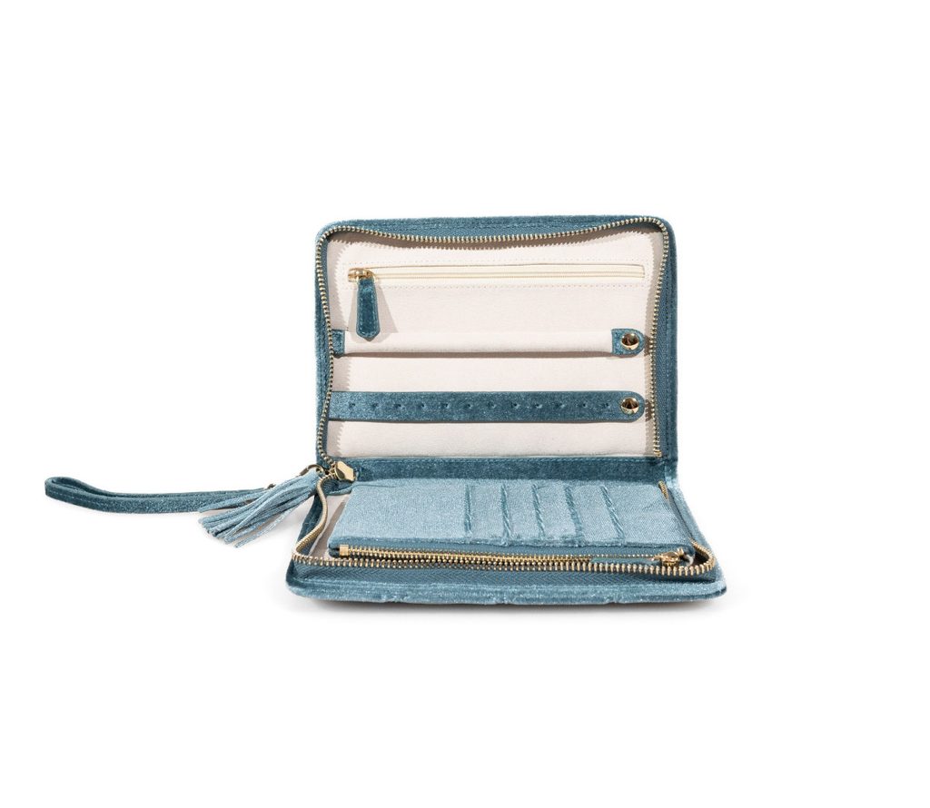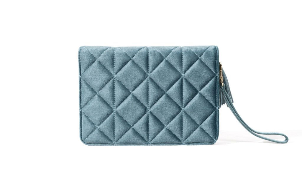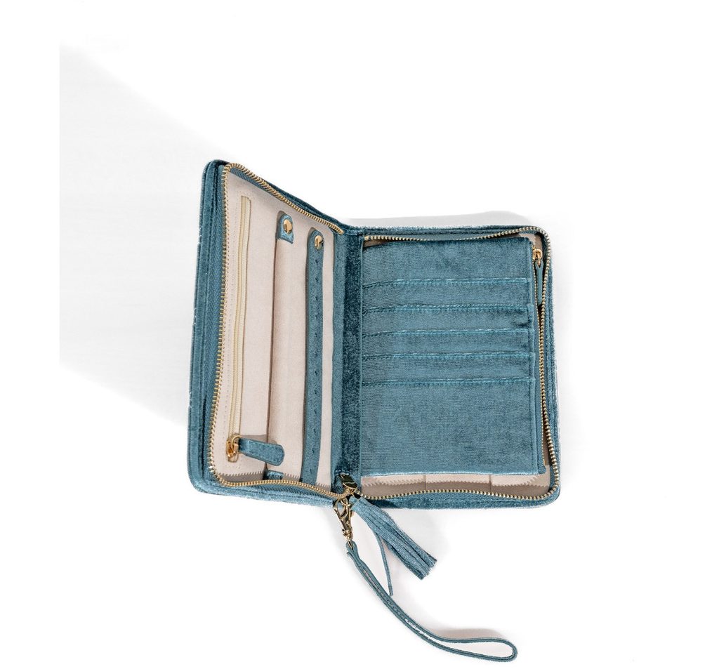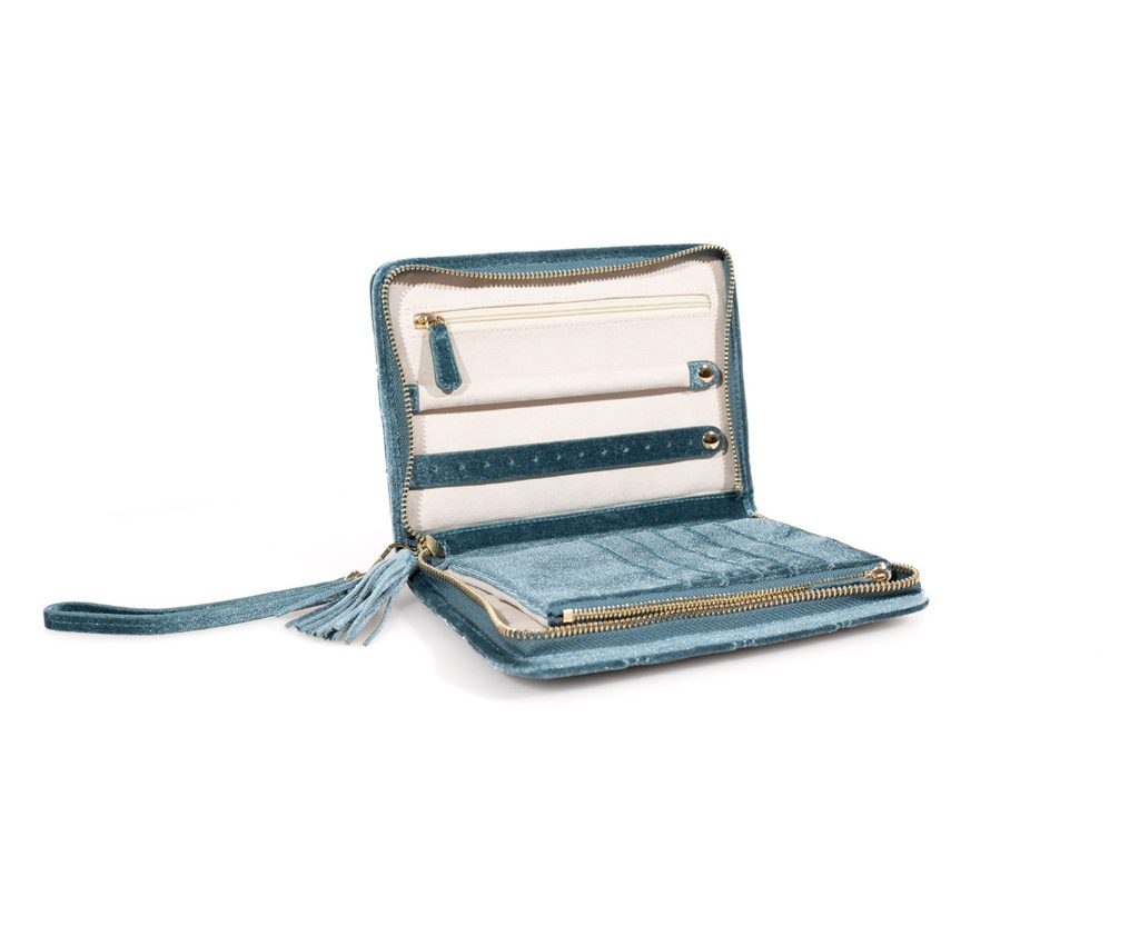 The Friedrich Lederwaren Chenille 23341-5 jewellery box in light blue is made of a very pleasant chenille material. It is a fine material with a quilted pattern. The zipper and inner metal elements are in gold and the interior is in beige.