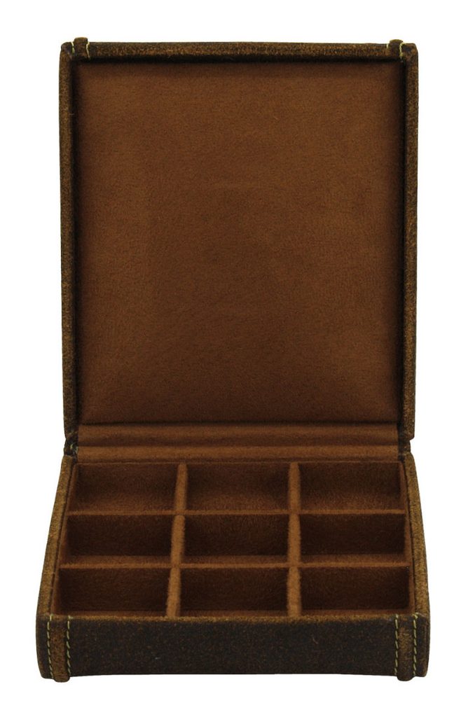 The Friedrich Lederwaren Cubano 27033-6 brown jewellery box is made of leather in a scuffed vintage style.