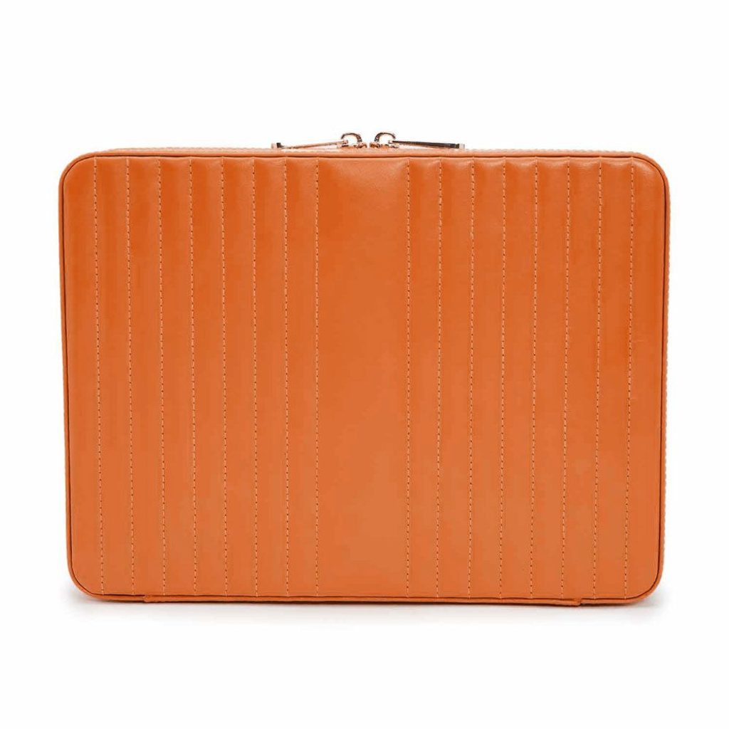 Travel jewelry box Wolf Maria Large 766139 orange with orange interior. Made of smooth leather accented with gold color details. The perfect travel jewelry box that will fit in any travel bag or even purse.