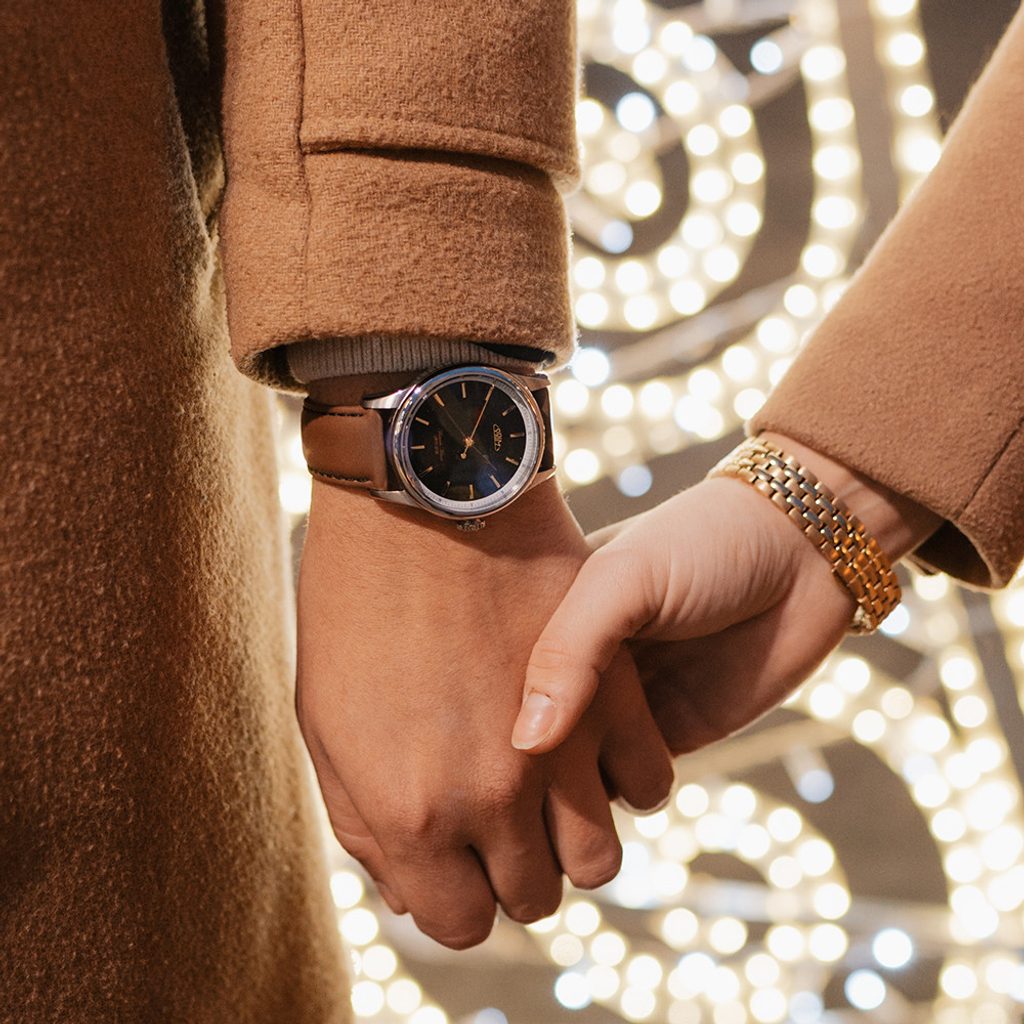 Other unmistakable elements are the edge-moulded dial with vertical linear cut and the applied indices in gold and polished finish. Also worth mentioning is the detailed seconds hand, which follows the curved shape of the dial at the end. The case has been specially adapted for this model and is made of 316L stainless steel with a water resistance of 5 ATM and features a combination of polished and brushed elements. The watch features a slightly domed sapphire crystal with anti-reflective treatment.
