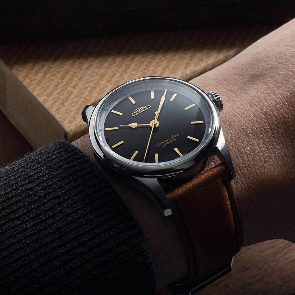The overall impression of the watch is enhanced by the choice of a handmade and carefully stitched strap made from premium cowhide leather. The strap features quick-release masts for easy replacement and is complemented by a distinctive, polished stainless steel buckle with a precision engraved PRIM logo.