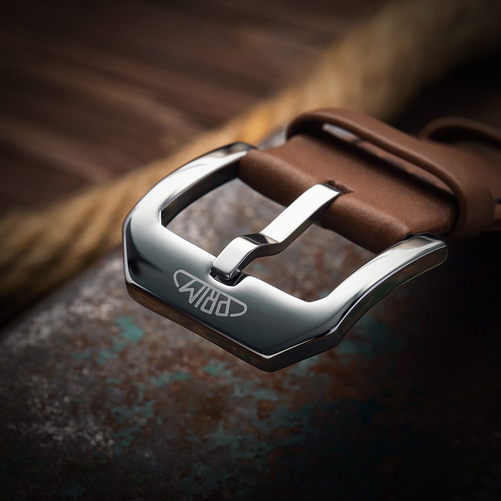 The overall impression of the watch is enhanced by the choice of a handmade and carefully stitched strap made from premium cowhide leather. The strap features quick-release masts for easy replacement and is complemented by a distinctive, polished stainless steel buckle with a precision engraved PRIM logo.
