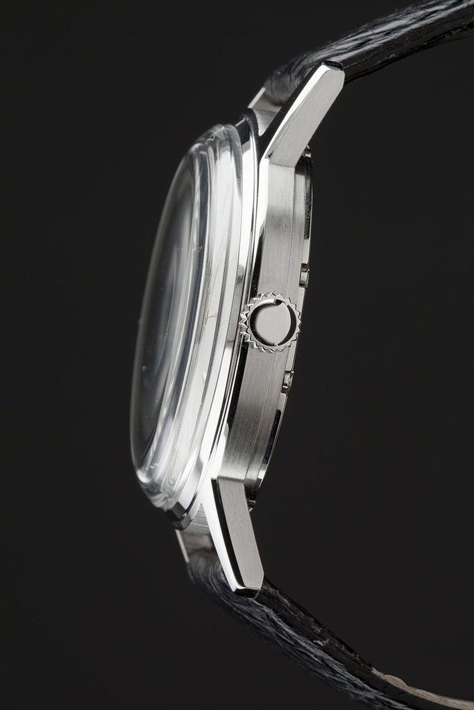 The watch is fitted with a cylindrical sapphire crystal that respects the shape of the original plastic crystal used in the second half of the last century. The glass is cut from a single piece of sapphire crystal.