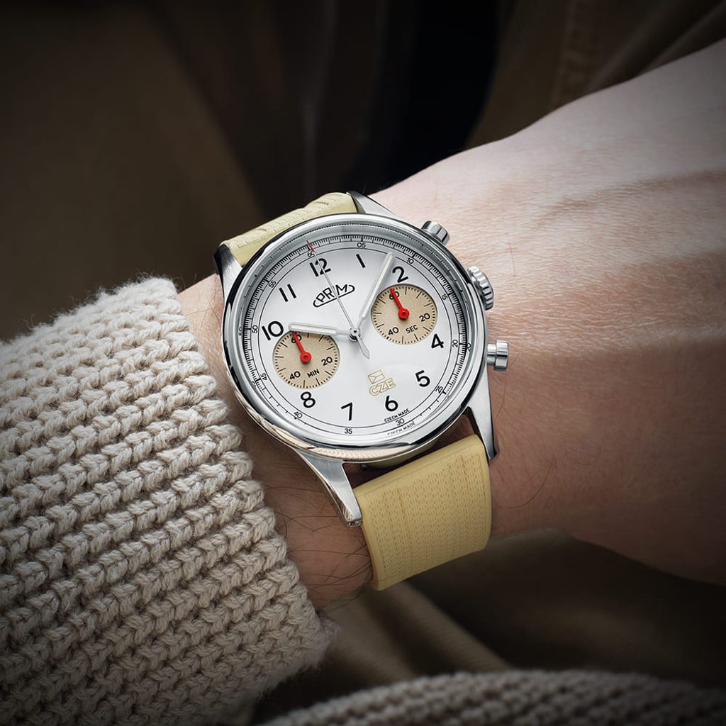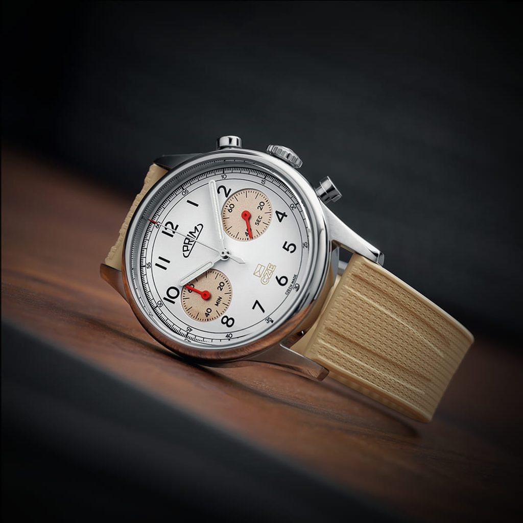 Instead of working with traditional national colours, Prim has chosen a different approach. The champagne metallic of the sub-dials combined with a subtle imprint of the Czech flag motif and the "CZE" marking underlines the character of the celebration and the uniqueness of the moment.