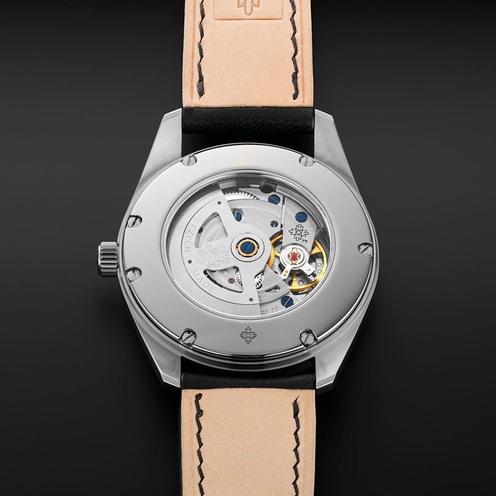 The timelessly elegant dial design and elaborate case, characterised by decorative milling, will not go out of fashion even decades from now. The stainless steel crown is decorated with the pictogram of the New Town Arches, which is a symbol of prestige and luxury of wristwatches with in-house manufacture PRIM calibre 98.00 - self-winding. The specially cut cylindrical sapphire crystal is shaped like the original glass. The water resistance of the watch is 5 ATM.