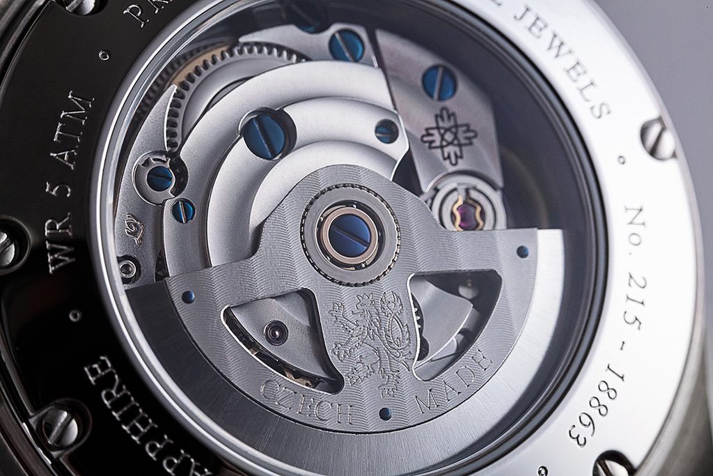 The timelessly elegant dial design and sophisticated case, characterised by decorative milling, will not go out of fashion even decades from now. The stainless steel crown is adorned with the pictogram of the New Town Arches, which is a symbol of prestige and luxury of wristwatches with in-house manufacture PRIM calibre 98.00. The shape of the specially cut cylindrical sapphire crystal matches the original shape of the glass. The water resistance of the watch is 5 ATM.
