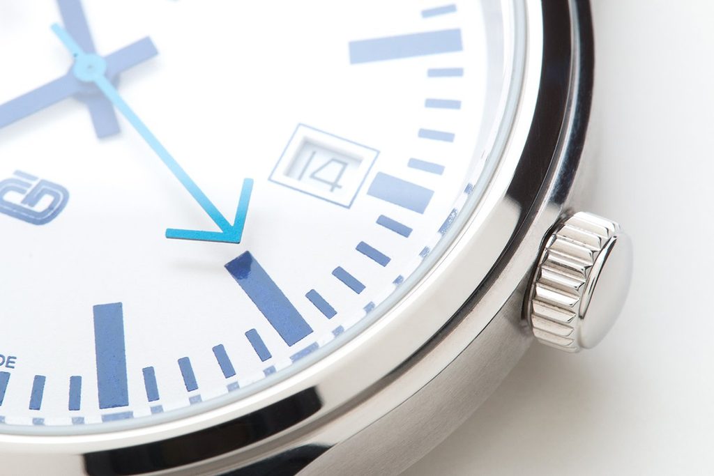 Thedistinctive and clear dial is dominated by the typical dark blue, which is enlivened by a lighter shade of blue on the arrow-shaped second hand. The dark blue leather strap was designed especially for this model.