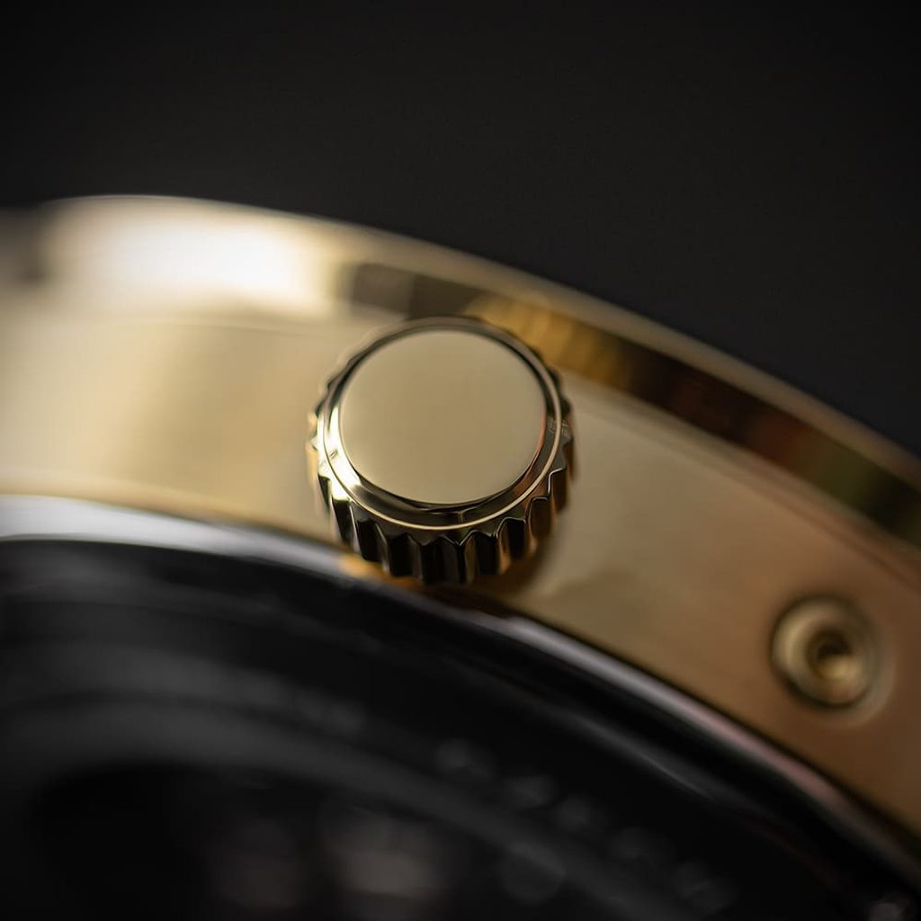 The watch case is made of stainless steel with a PVD finish in gold and the watch stays on the wrist thanks to a well-crafted leather strap with a thorn buckle.