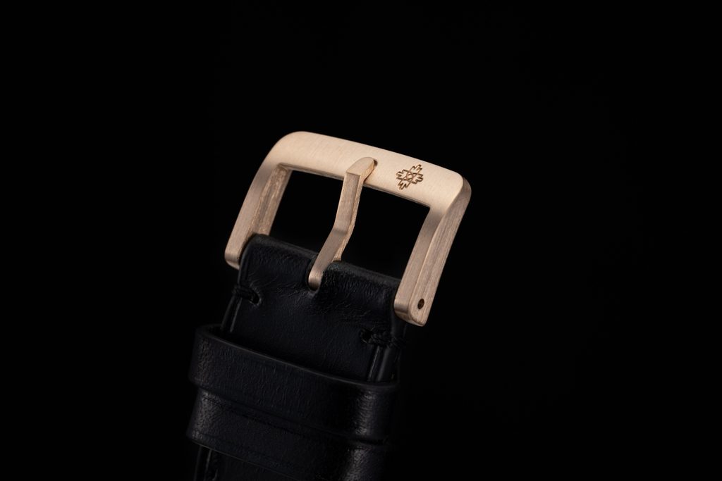 The space around the back cover is ready for placing your name, motto or an important date. This personalization is included in the price of the model. The high-quality leather strap comes from the workshop of a Czech master bagmaker.