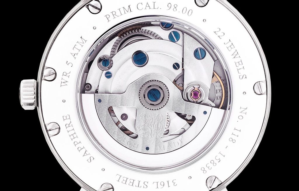 The PRIM PAVOUK 40 C 98-246-340-00-1 model is also characterised by a dial with a complex embossed relief and raised indices, which, like the hands, are either in the metal of the case or in rose gold. The case is made of stainless steel in the basic version, but can also be made of yellow, white or rose gold on request. Customers can also choose from four dial colour options. The watch is equipped with an in-house manufacture movement with manual winding PRIM calibre 98.00.