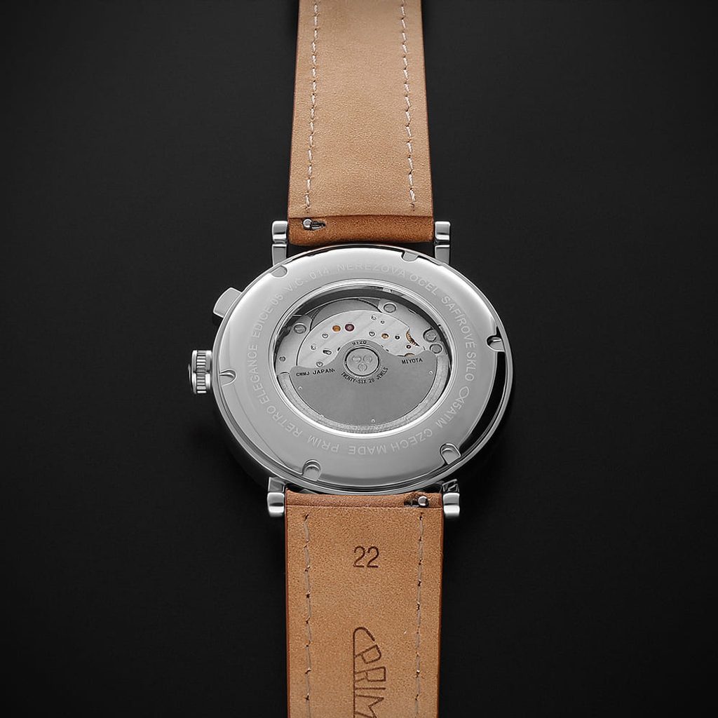 PRIM Retro Elegance 25 - elegant men's watch with Miyota 9120 calibre, sapphire crystal, transparent dial and leather strap in various colours. A classic in a modern concept. A new collection of men's watches that combines pure design with precision craftsmanship.