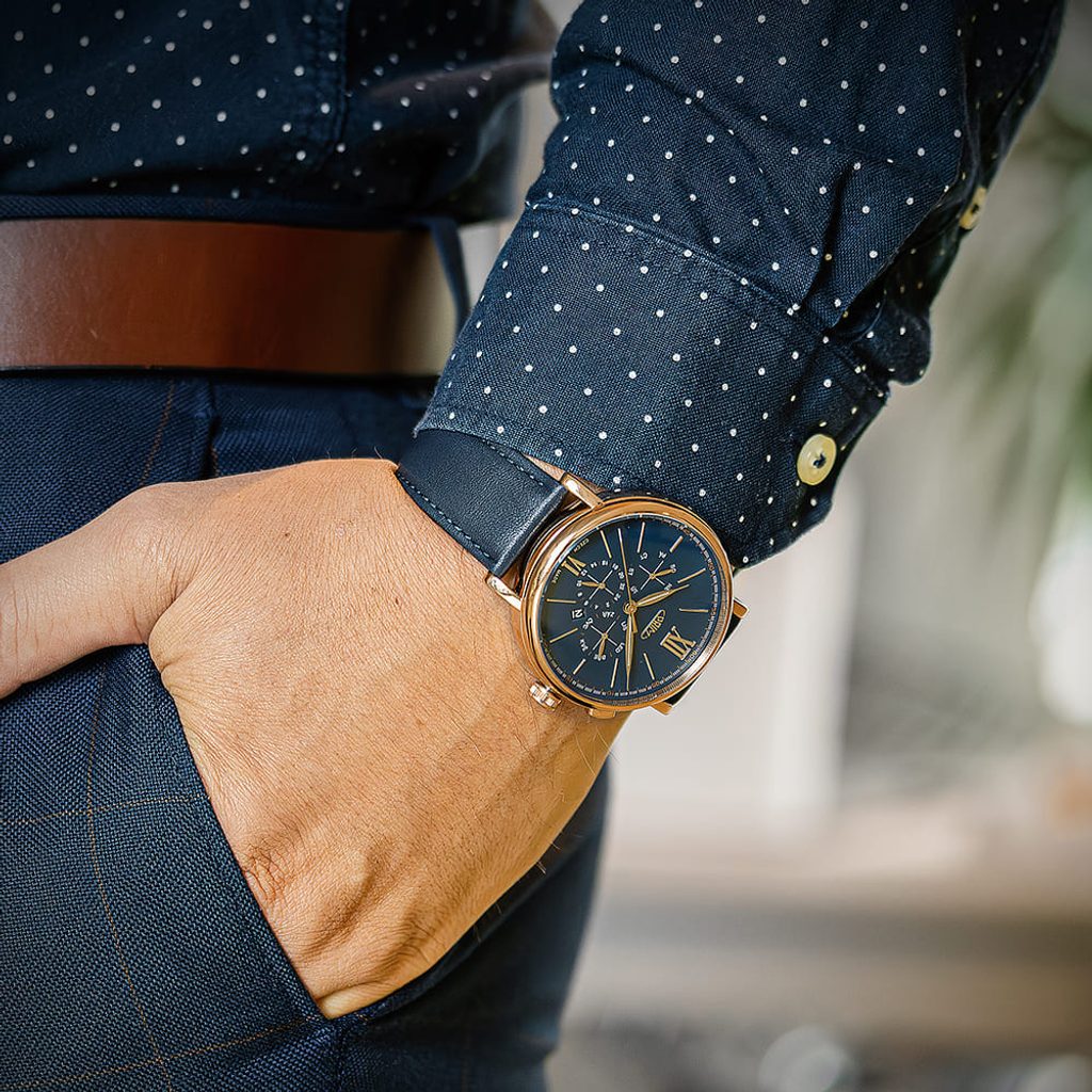 The model has several practical functions. The date display can be found at the 3 and 4 o'clock position. The left sub-dial shows the day of the week, the right sub-dial shows the month and the last sub-dial at the 6 o'clock position is used for the 24-hour time display.