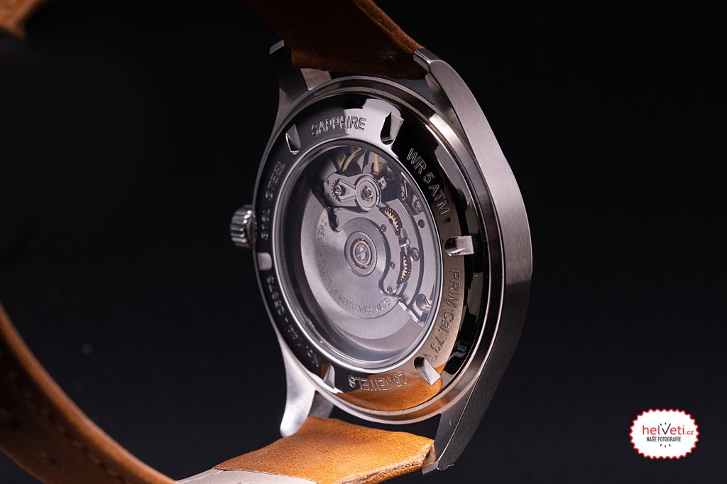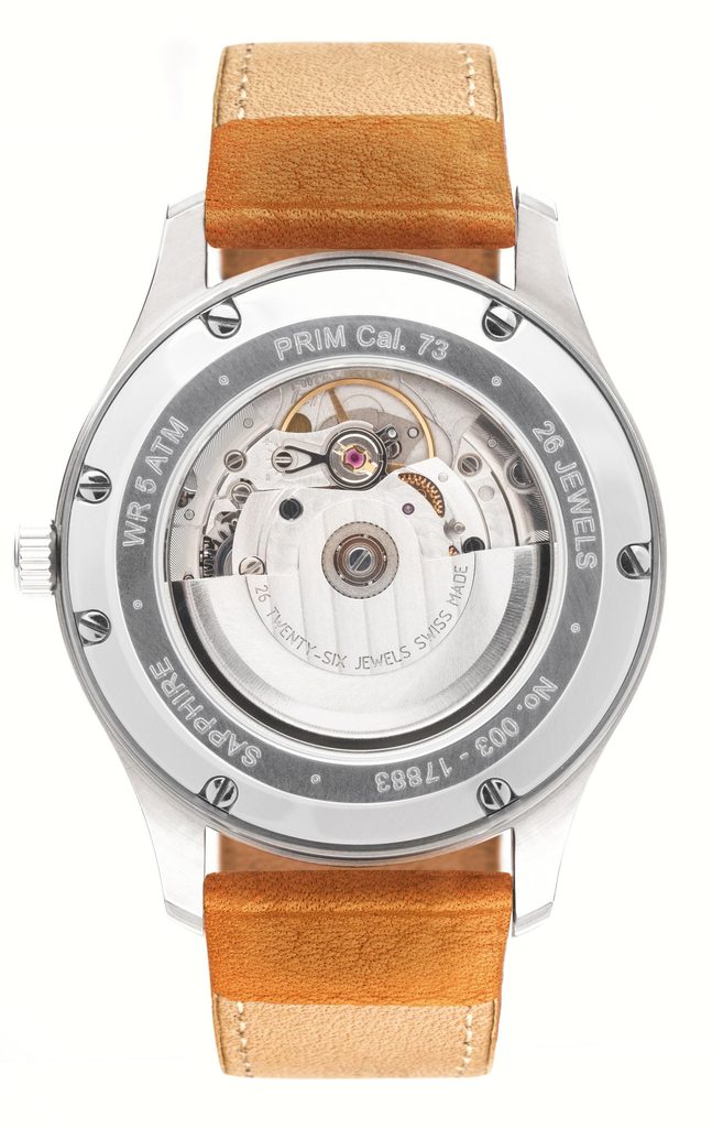 The watch uses the PRIM Calibre 73 automatic winding movement (ETA 2824-2) with a power reserve of 38 hours.