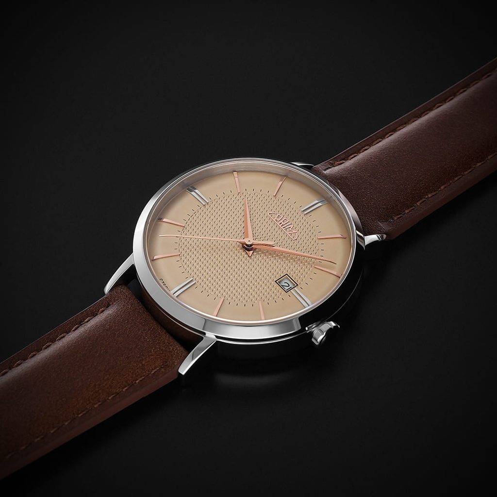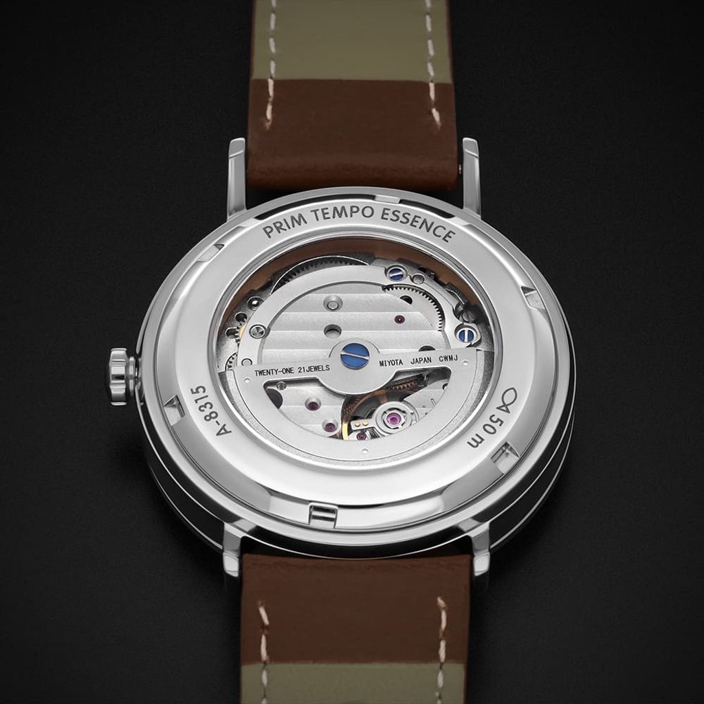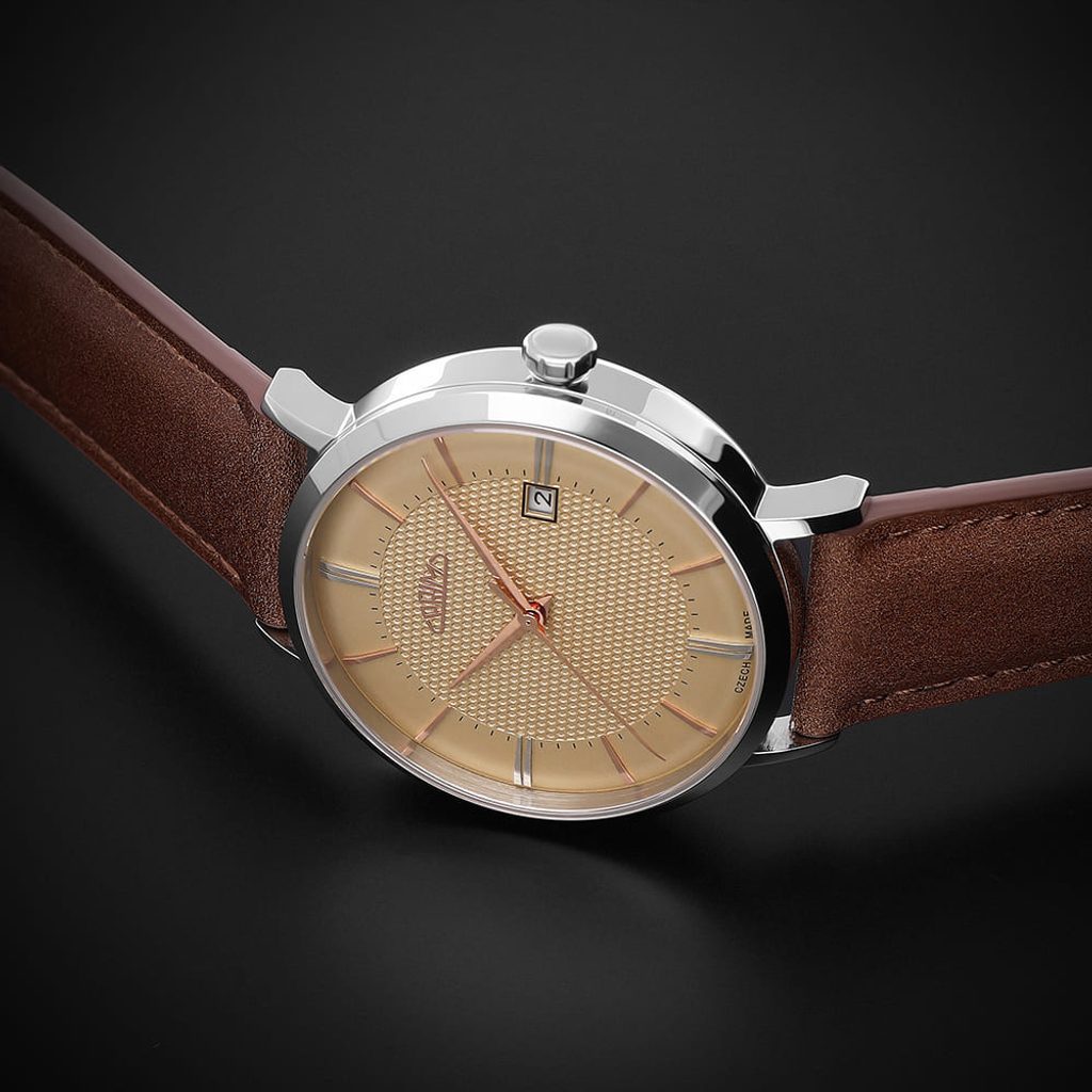 The attractive combination of case and dial colours in multiple variations, the date in the dial colour and subtle indices accentuate the minimalist concept of this watch and pay tribute to the Czech watchmaking world. The design was created by a young aspiring designer who was inspired by the 1960s.