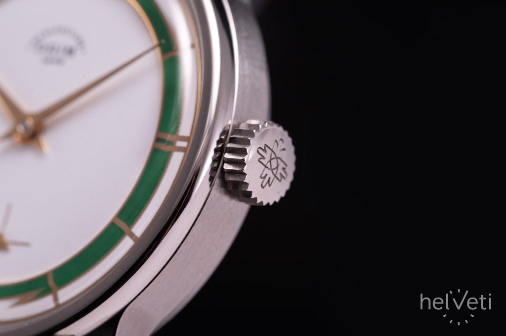 The most striking designelement of the limited edition PRIM TRAKTOR 34 is undoubtedly the sophisticated folding dial. The contrasting ceramic bezel in an attractive green colour stands out impressively on a white background. The elegant look of the watch is enhanced by the subtle gilded indices and the off-centre seconds hand, typical of the original model. The newly designed 34 mm case is ideal for everyday wear thanks to its size and shape.