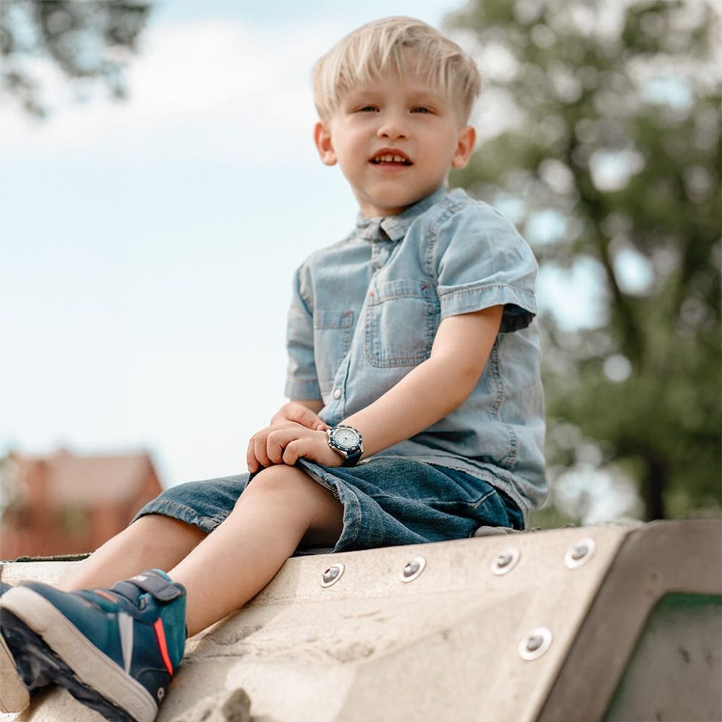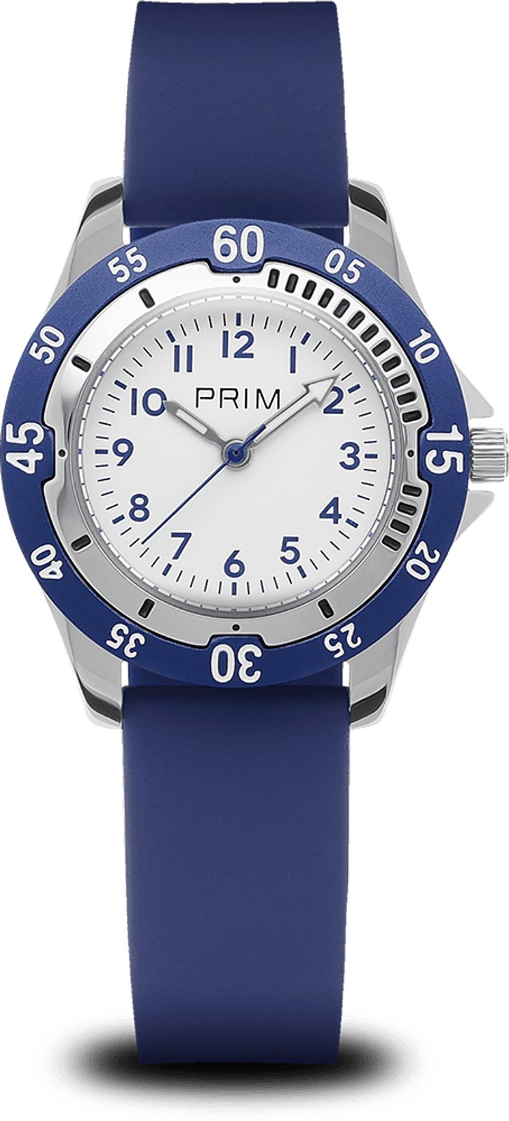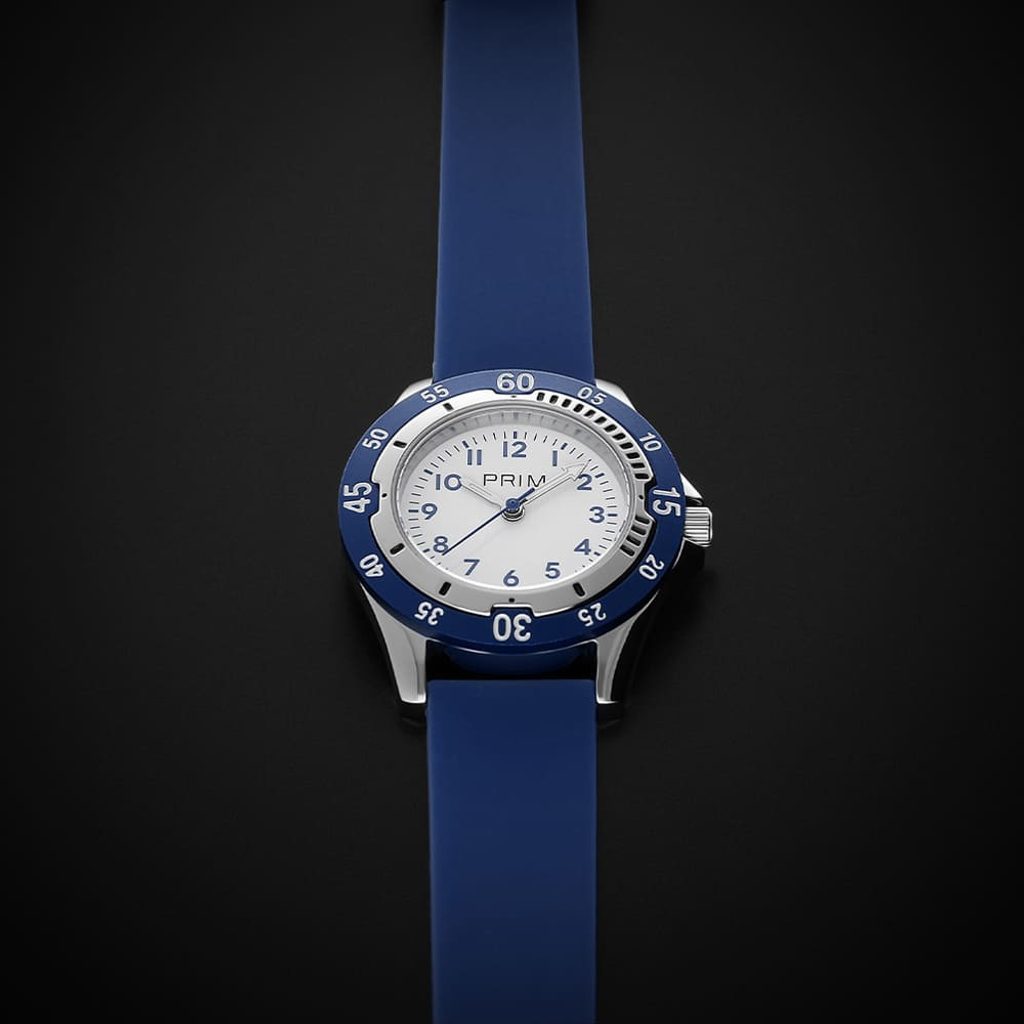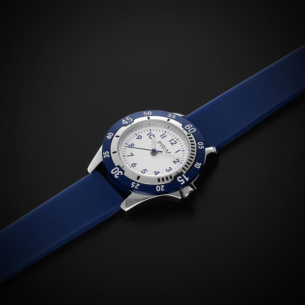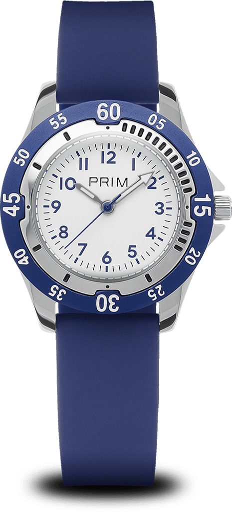 The graphics team was inspired by the legible and easily recognizable dial with Arabic numerals in the colours of the ring, and complemented the model with coloured hands. We have also chosen bright colours that every schoolchild can choose from to learn how to tell the time on their first PRIM watch. It is also practical to display the minutes on the fixed circle to help tell the time. The watch is completely made of 316L stainless steel and has a water resistance of 10 ATM. The overall look is complemented by the colourful comfortable silicone strap.