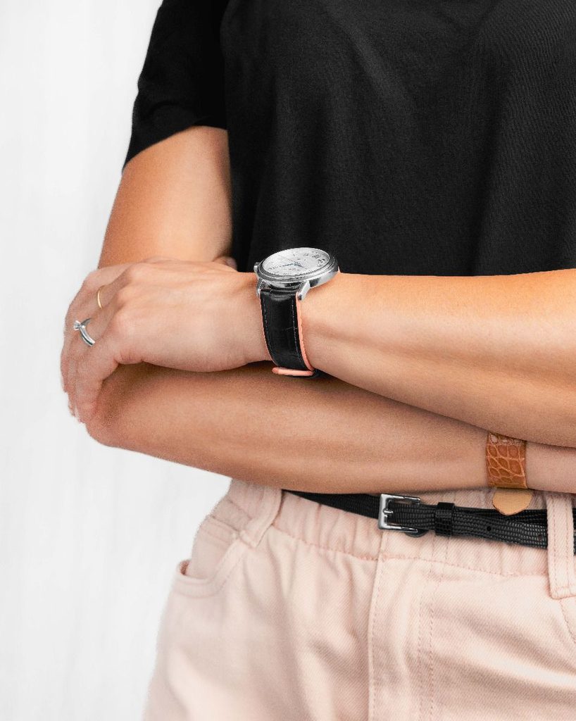 The upper is made up of Italian calfskin with realistic alligator embossing, while the bottom features a coloured Hirsch Premium Caoutchouc rubber core that provides proper comfort while accentuating the sporty design. A high-quality stainless steel buckle is also an integral part of the design.