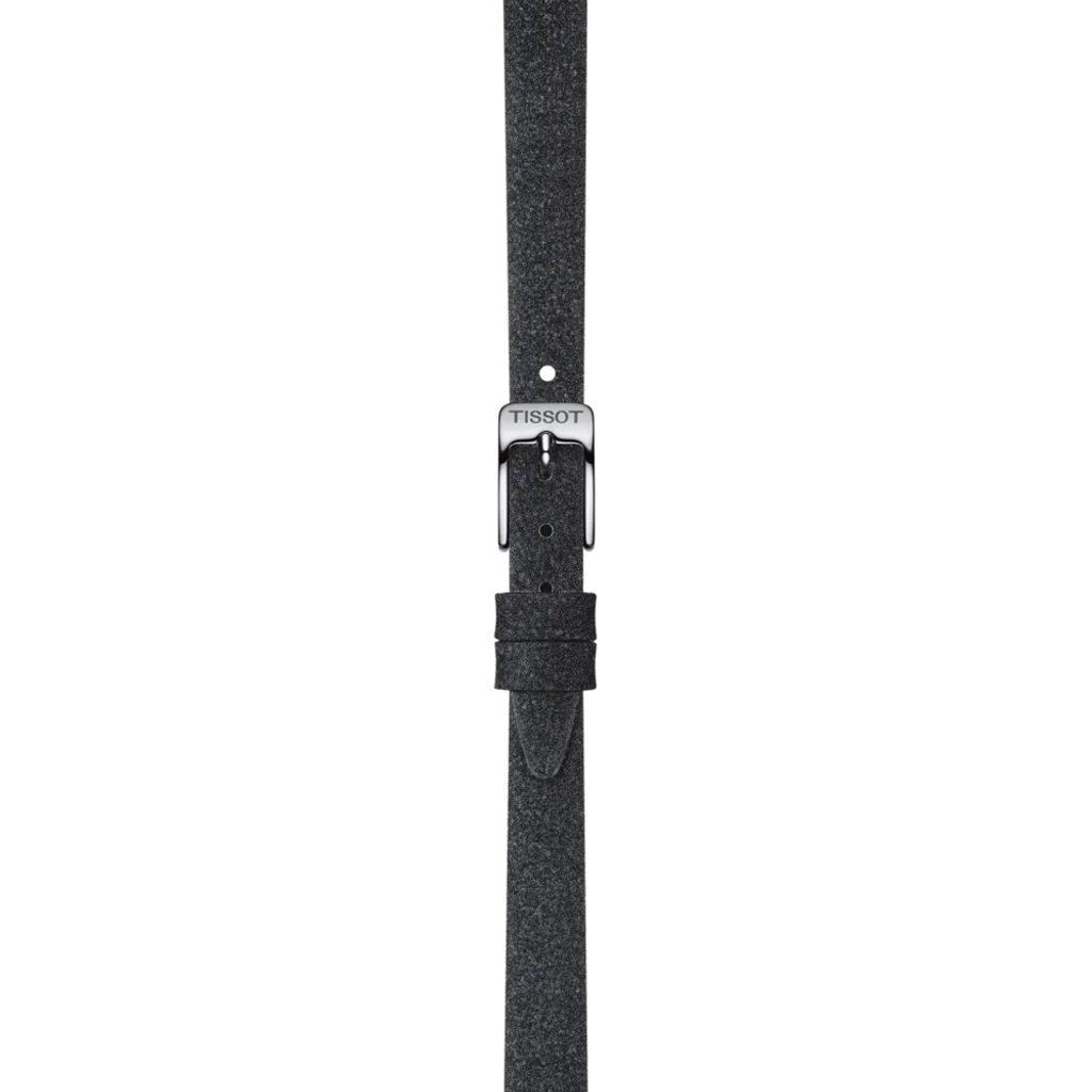 The original black Tissot T852.048.076 strap is made of synthetic and features an easy quick-release system and a classic stainless steel thorn buckle.