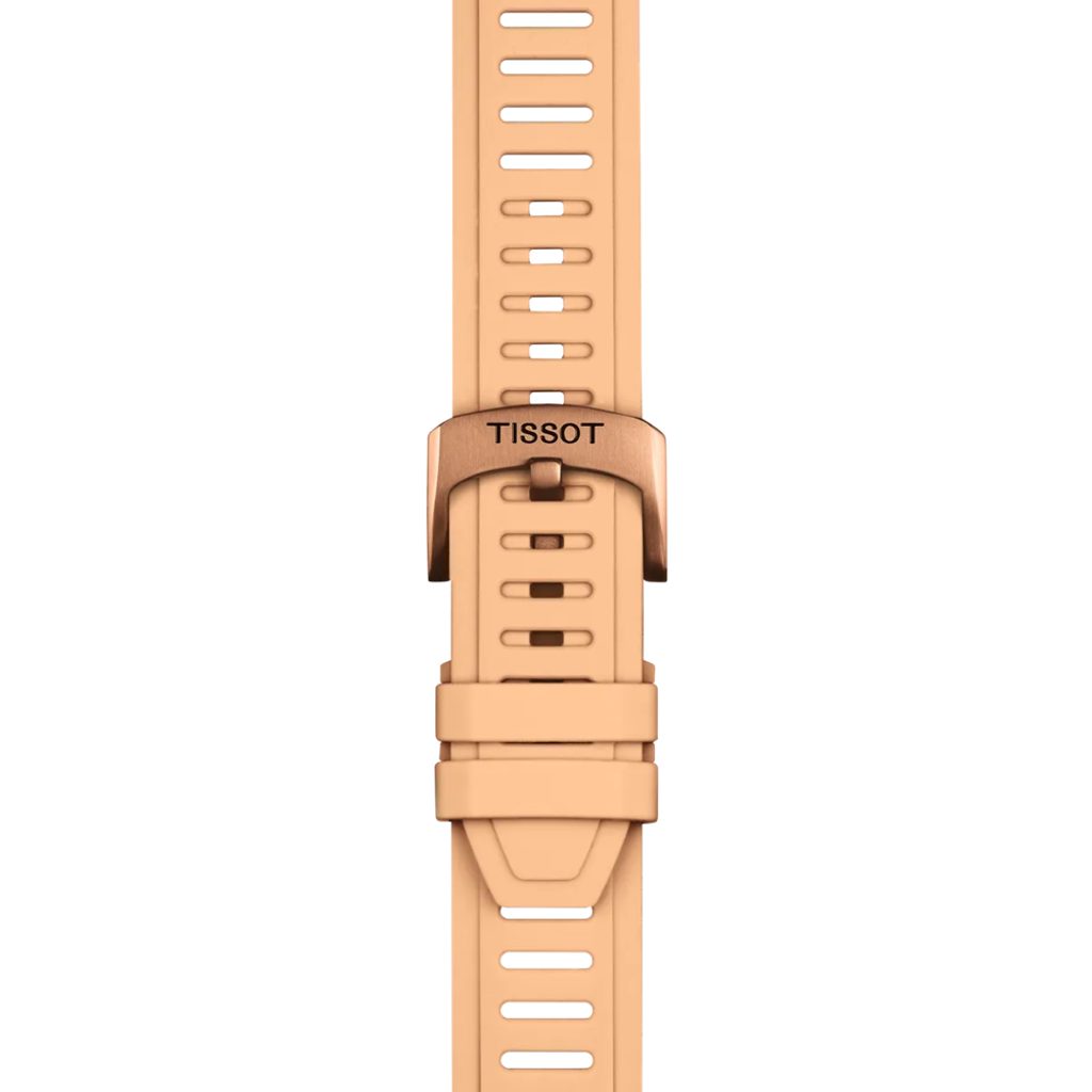 The original beige Tissot T852.050.298 strap is made of durable and flexible silicone, features an easy-to-use quick-release system and a classic rose gold PVD-finished titanium thorn buckle.