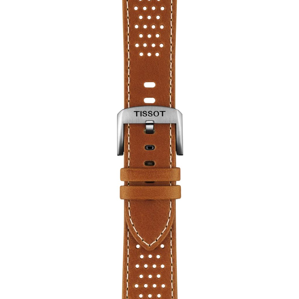 The original brown Tissot T852.051.017 strap is made of embossed cowhide leather and features an easy quick-release system and a classic stainless steel thorn buckle.