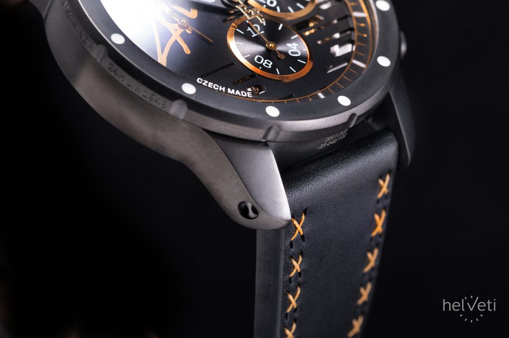 The watch case with a black PVD finish is made of grade 5 titanium and is complemented by a very comfortable leather strap with distinctive gold stitching, finished with a thorn buckle.