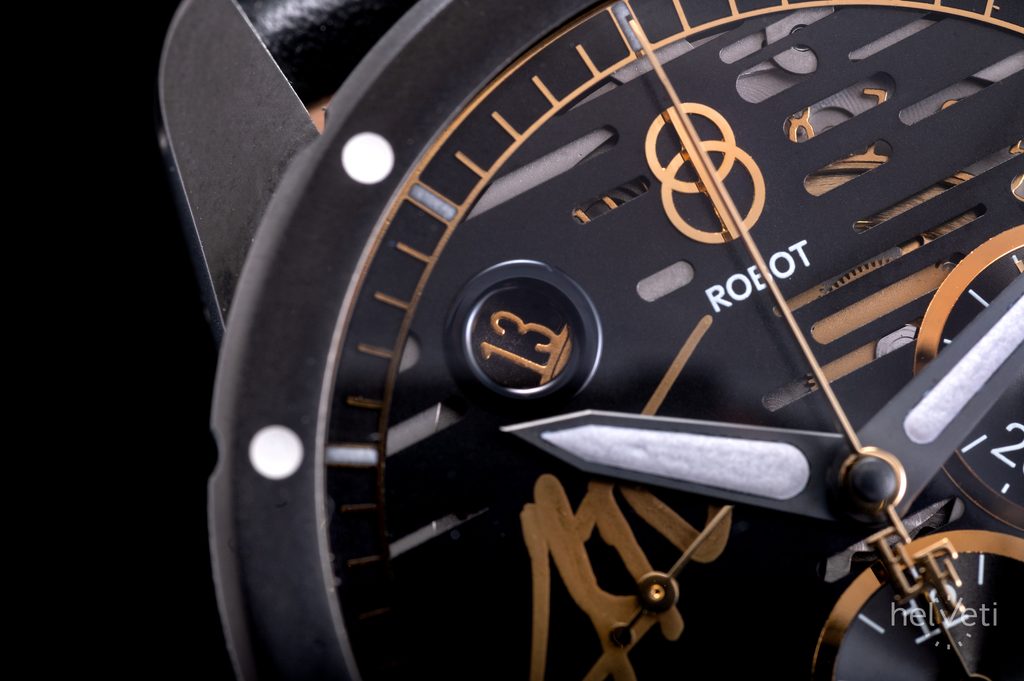 The dial is protected by an anti-reflective sapphire crystal. The glass features high scratch resistance and excellent readability in direct light. Sapphire has also been used for the caseback, through which the operation of the specially decorated movement for the Robot can be observed.