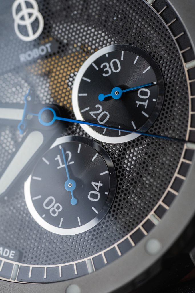 The Robot Minor Monaco Black has a black perforated dial with a contrasting minute scale on the outer perimeter and two clear sub-dials. Silver and blue elements provide the accents. The sub-dial at the 3 o'clock position is a 30-minute counter and the 12-hour counter at 6 o'clock. At the 9 o'clock position is the seconds hand. The date is placed at an unusual position at 11 o'clock and impresses with a skeletonized date wreath. The whole is suitably complemented by hand-finished hands - the hour and minute hands milled and polished; the second hand polished.