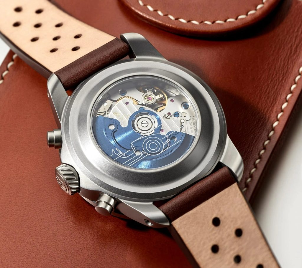 The watch is powered by a Swiss La Joux-Perret L100 mechanical movement with a power reserve of up to 55 hours. With a frequency of 28,800 semi-frequencies per hour, the movement offers a winding crown, a stop-seconds function when setting the time (hacking), date and stopwatch.