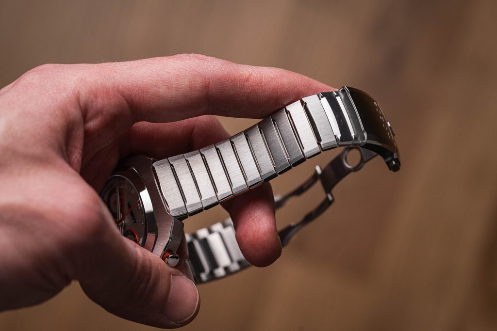 The 43,2 mm diameter, 14,8 mm high case is complemented by a sophisticated integrated bracelet made of 904L steel. It is finished with a fold-over clasp with PrecisionFit - a hidden micro-adjustment system with the possibility of fine-tuning the bracelet size for maximum comfort on the wrist. Thanks to the SwapEasy quick-release system, the bracelet can be easily swapped for an alternative orange rubber or blue alligator leather strap, which you can choose from when purchasing the watch and is thus included as well as a practical leather travel case.