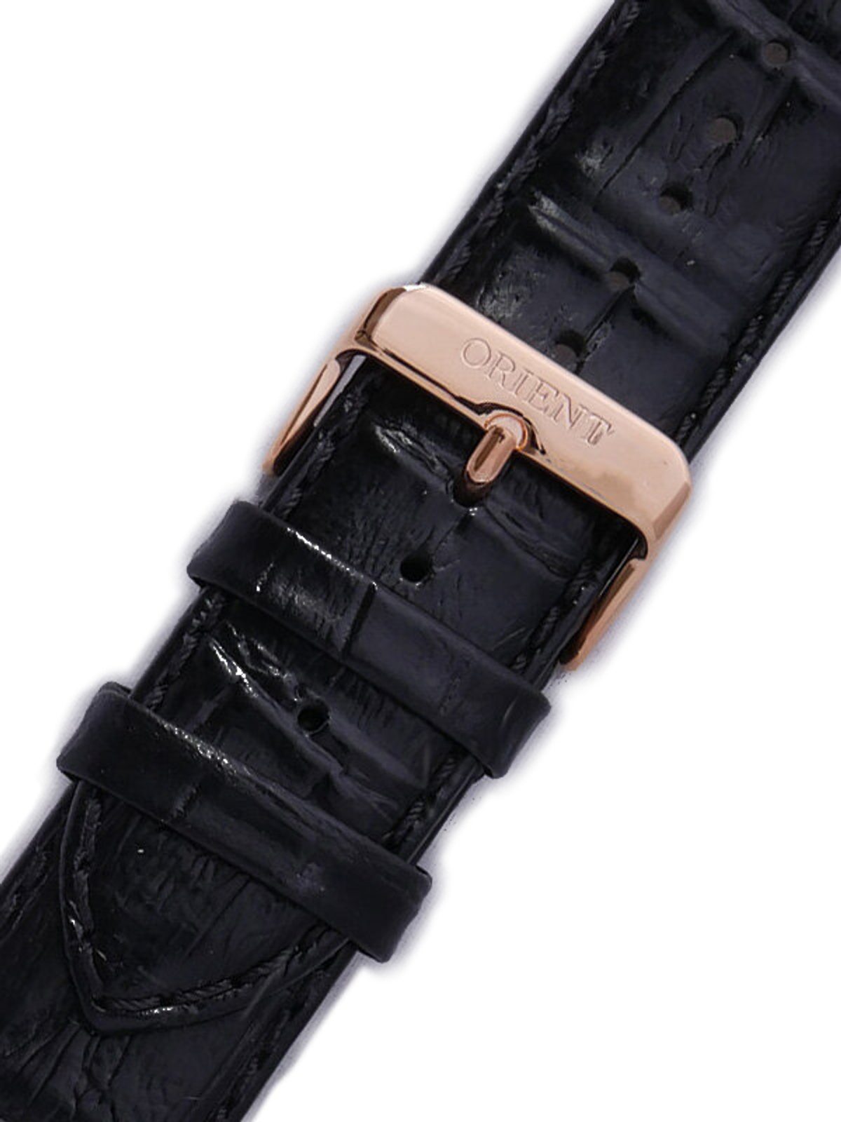 The original black leather Orient strap with a width of 24 mm boasts a practical rose gold buckle and a stylish design. Its high-quality workmanship and unique look also add a touch of elegance to your watch.