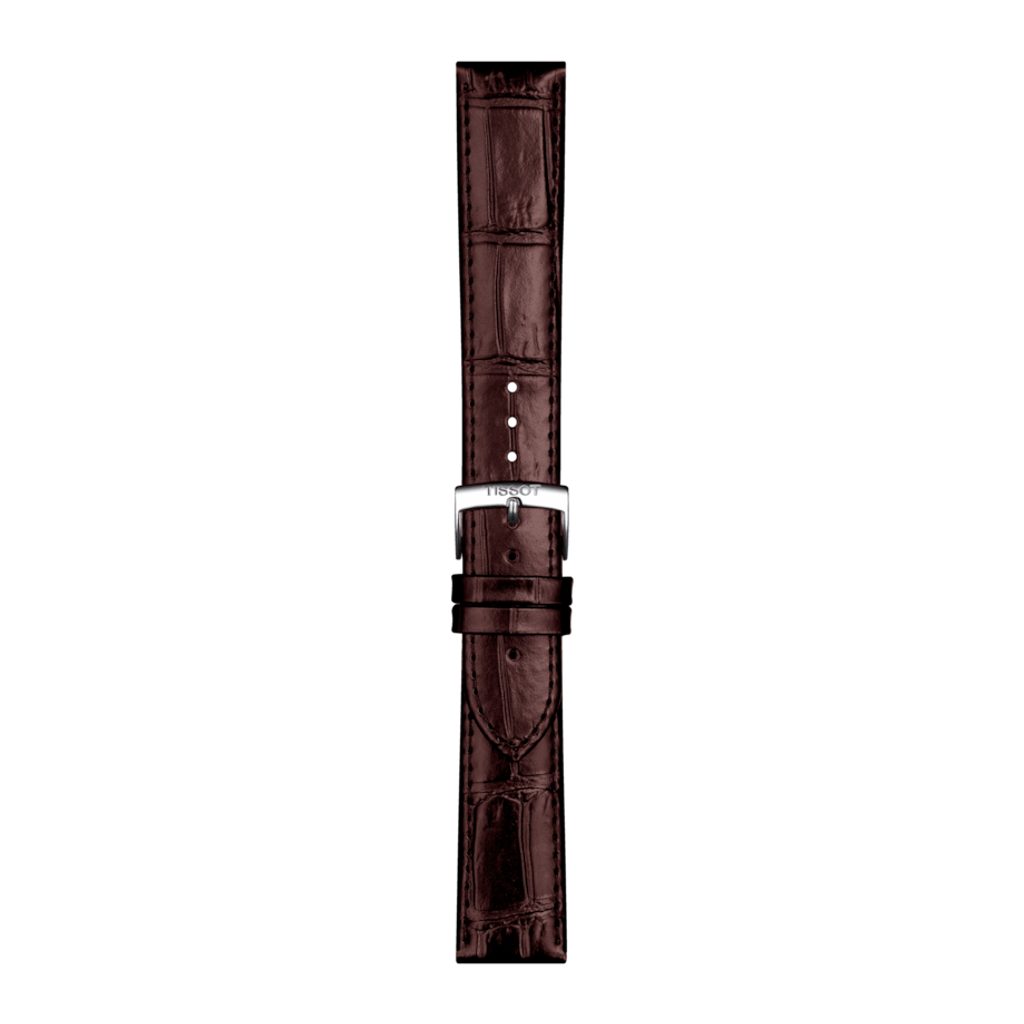 The original brown Tissot T852.043.013 strap is made of cowhide leather with an alligator pattern and features an easy quick-release system and a classic stainless steel buckle.