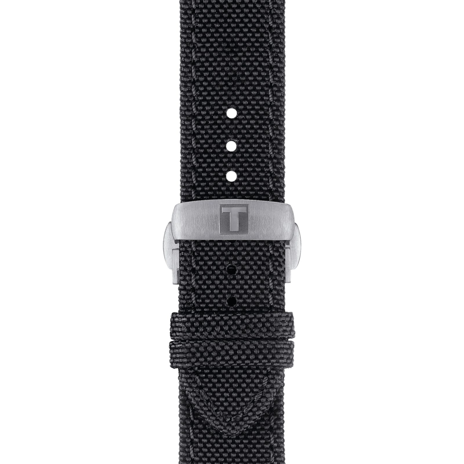The original black Tissot T852.043.157 strap is made of high-quality fabric and features an easy-to-use quick-release system and a stainless steel butterfly clasp.