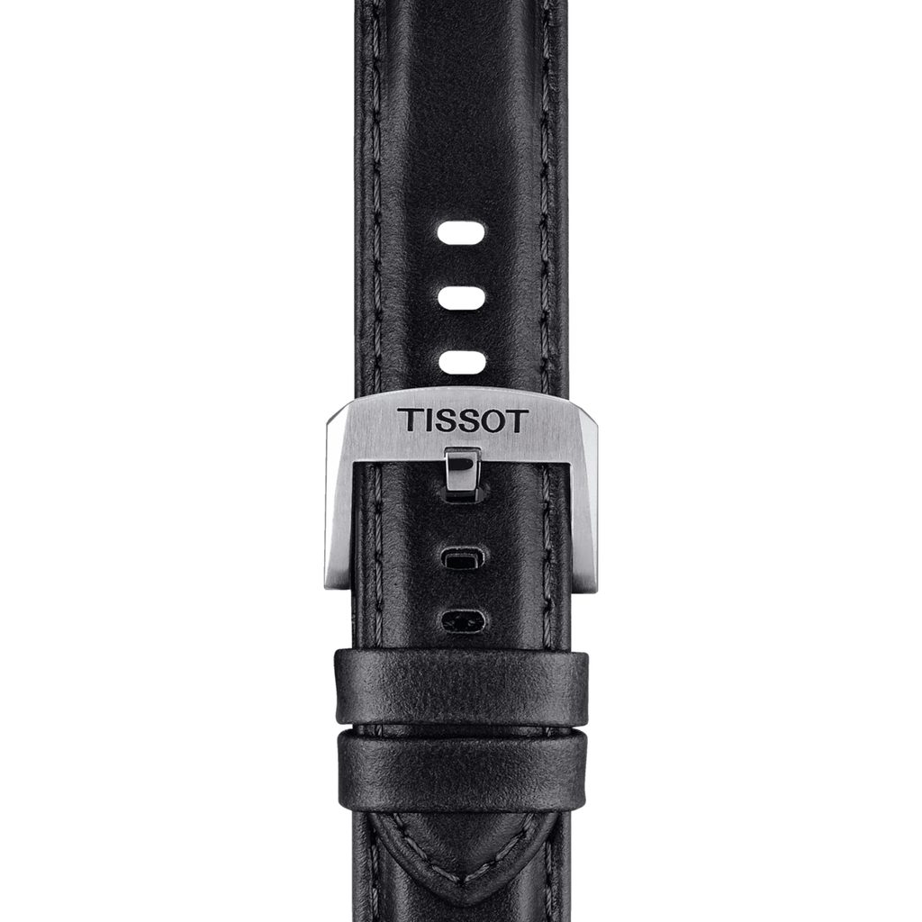 The original black Tissot T852.046.834 strap is made of embossed cowhide leather and features an easy quick-release system and a classic stainless steel thorn buckle.