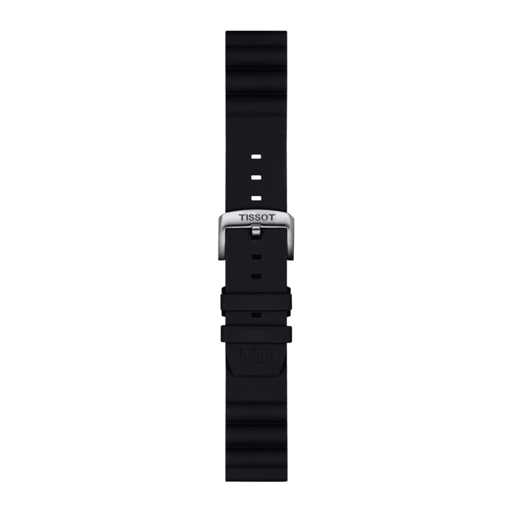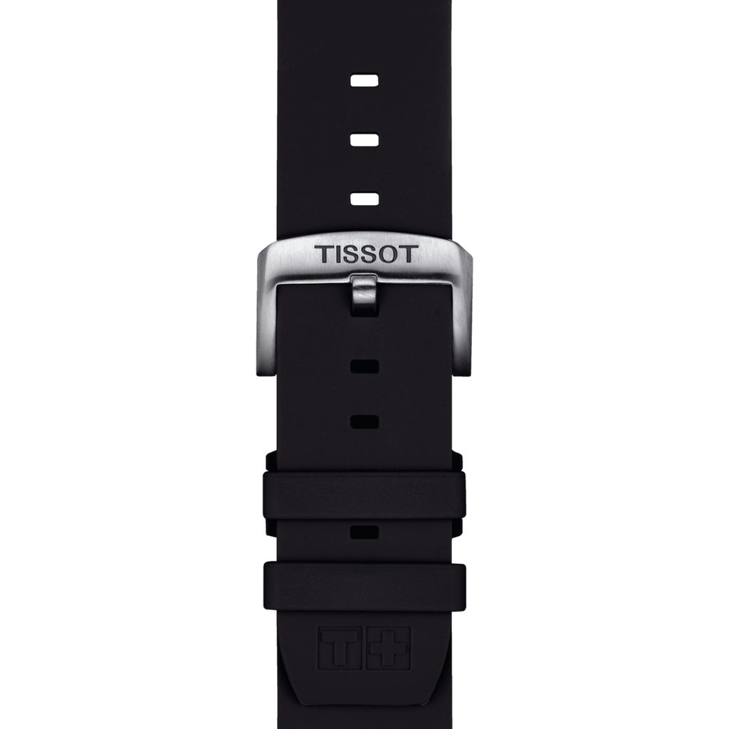 The original black Tissot T852.047.179 strap is made of durable and flexible silicone, features an easy-to-use quick-release system and a classic stainless steel thorn buckle.