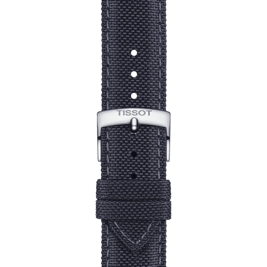 The original anthracite Tissot T852.048.183 strap is made of high-quality fabric with a unique scalloped design and features an easy quick-release system and a classic stainless steel thorn buckle.