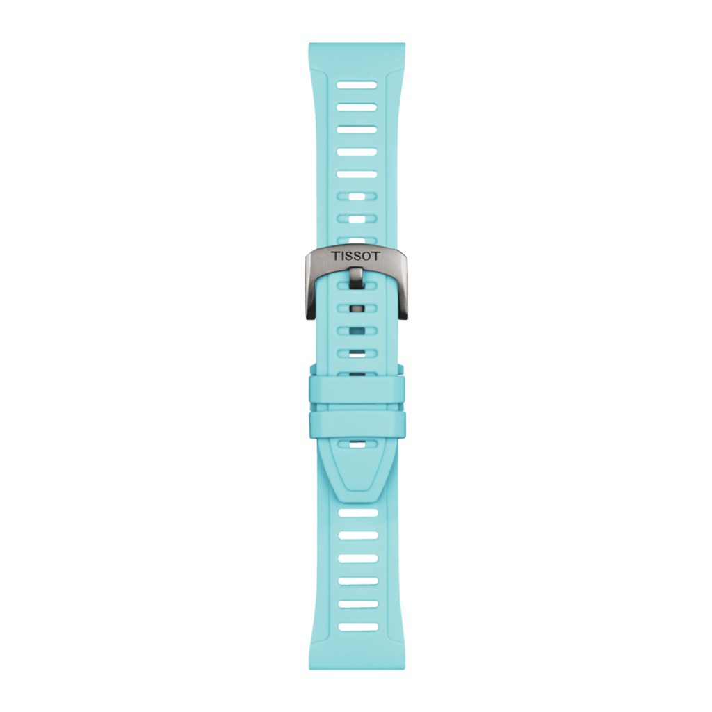 The original blue Tissot T852.049.329 strap is made of durable and flexible silicone, features an easy-to-use quick release system and a classic titanium thorn buckle.
