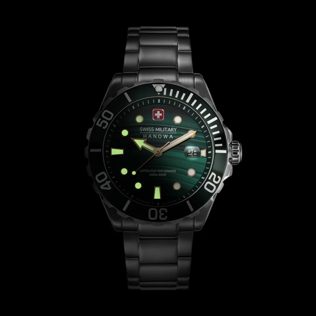 The men's Swiss Military Hanowa OFFSHORE DIVER GREEN WATER SMWGH0005804 embodies a fusion of classic Swiss design and sporty aesthetics. This reliable Swiss Made watch is built to withstand the demands of an active life.