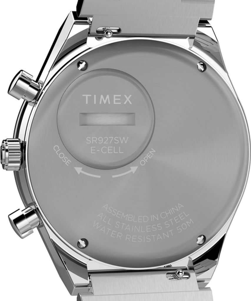 The battery-powered quartz watch has a water resistance of 50 m ( 5 ATM), so it can handle basic contact with water when washing hands, in the rain or in the shower. The model is equipped with a 20 mm wide steel bracelet. However, thanks to the Quick Release system, you can conveniently accessorize the watch with a sportier silicone strap, for example.