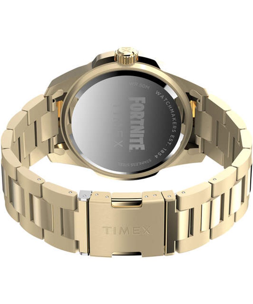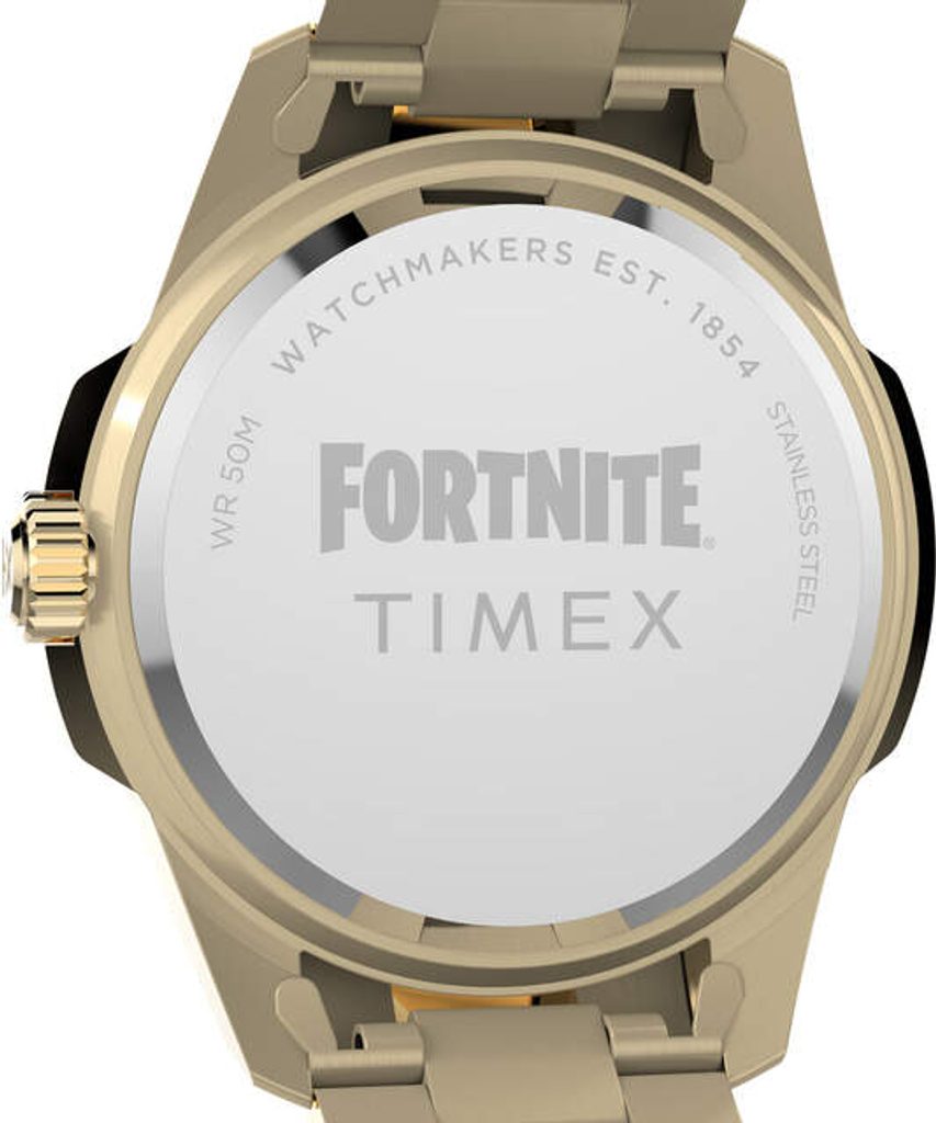 A combination of polished and brushed gold finishes are applied to the 46mm diameter steel case. The black dial serves as a backdrop for the distinctive solid hands, which are fitted with luminescence, but above all, it makes the distinctive gold Victory Royale inscription stand out, inspired by the legendary FORTNITE game. The model features a simple date window located at the traditional 3 o'clock position. Everything is then protected by a mineral crystal.