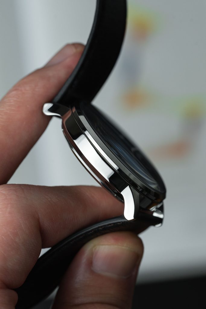 A combination of polished and brushed finishes are applied to the 40mm diameter steel case. The black dial serves as a base for the slim, elegant hands and indices. The model features a simple date window and a day-of-the-week indicator located at the traditional 3 o'clock position. All protected by a hardened mineral crystal.